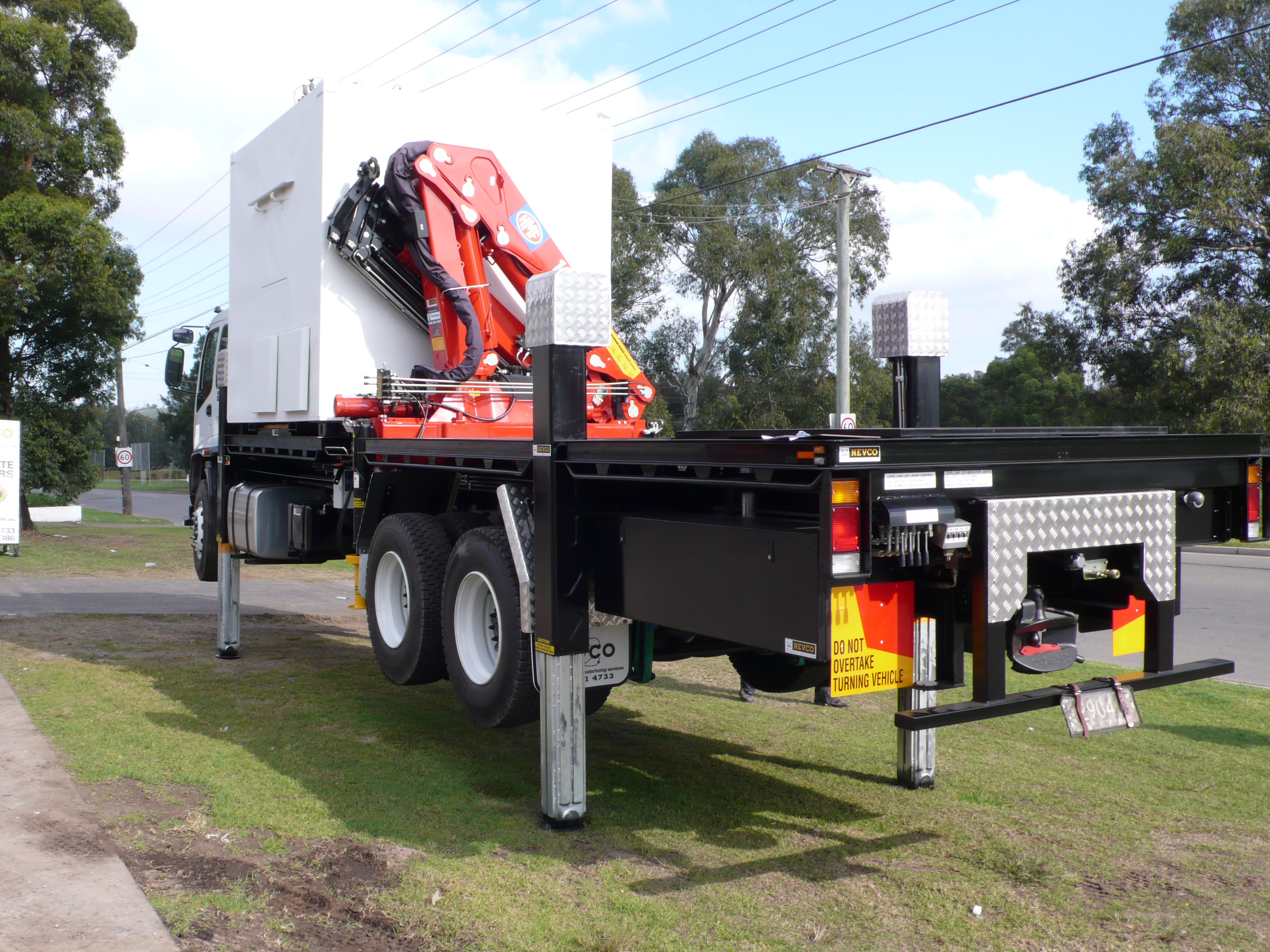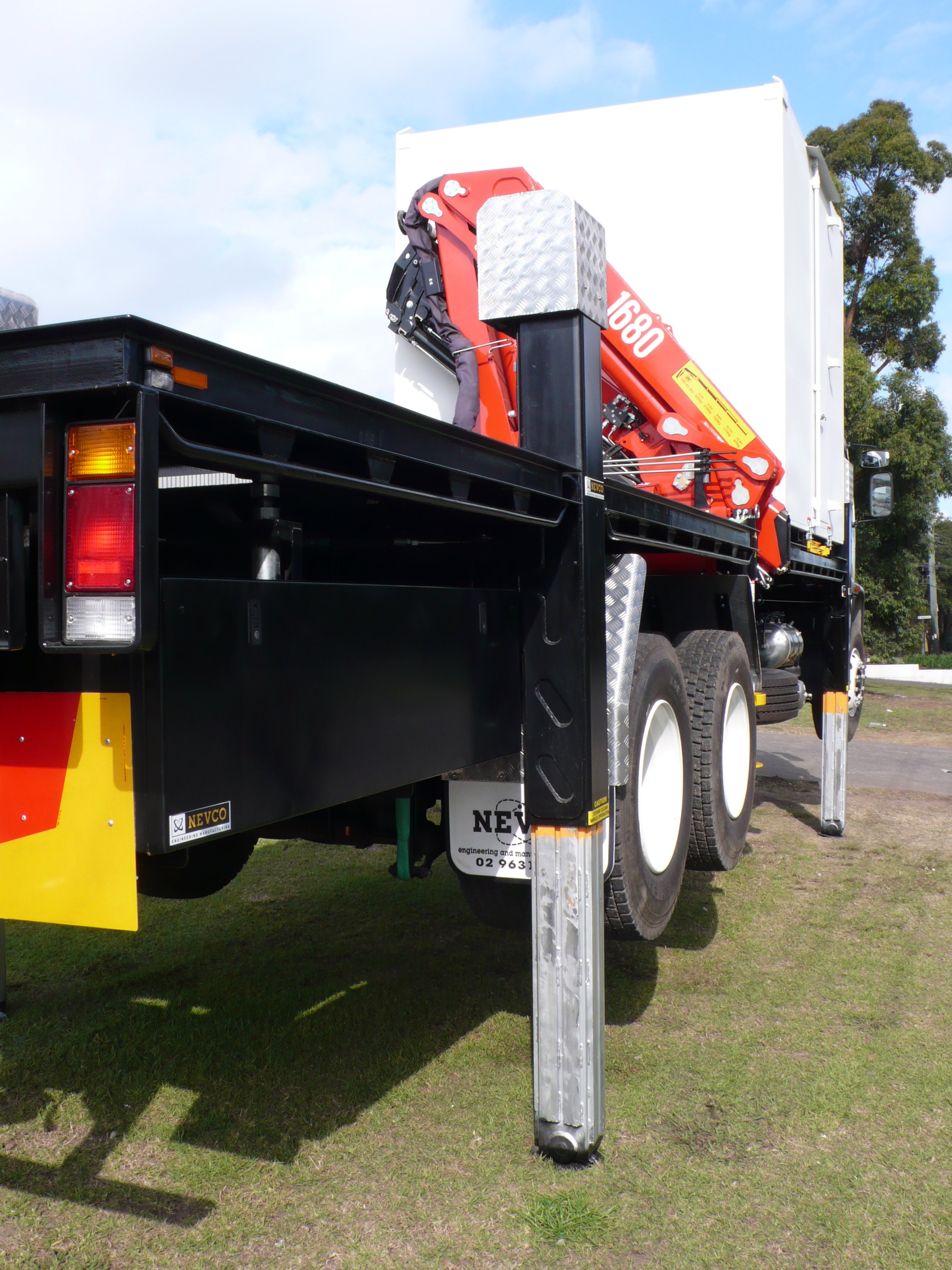 Nevco custom designed and manufactured a vehicle mounted levelling system to support a 16 ton-metre crane, a vehicle mounted microwave radiation proof office and system sub frame incorporating “twist lock” front and rear cargo space.