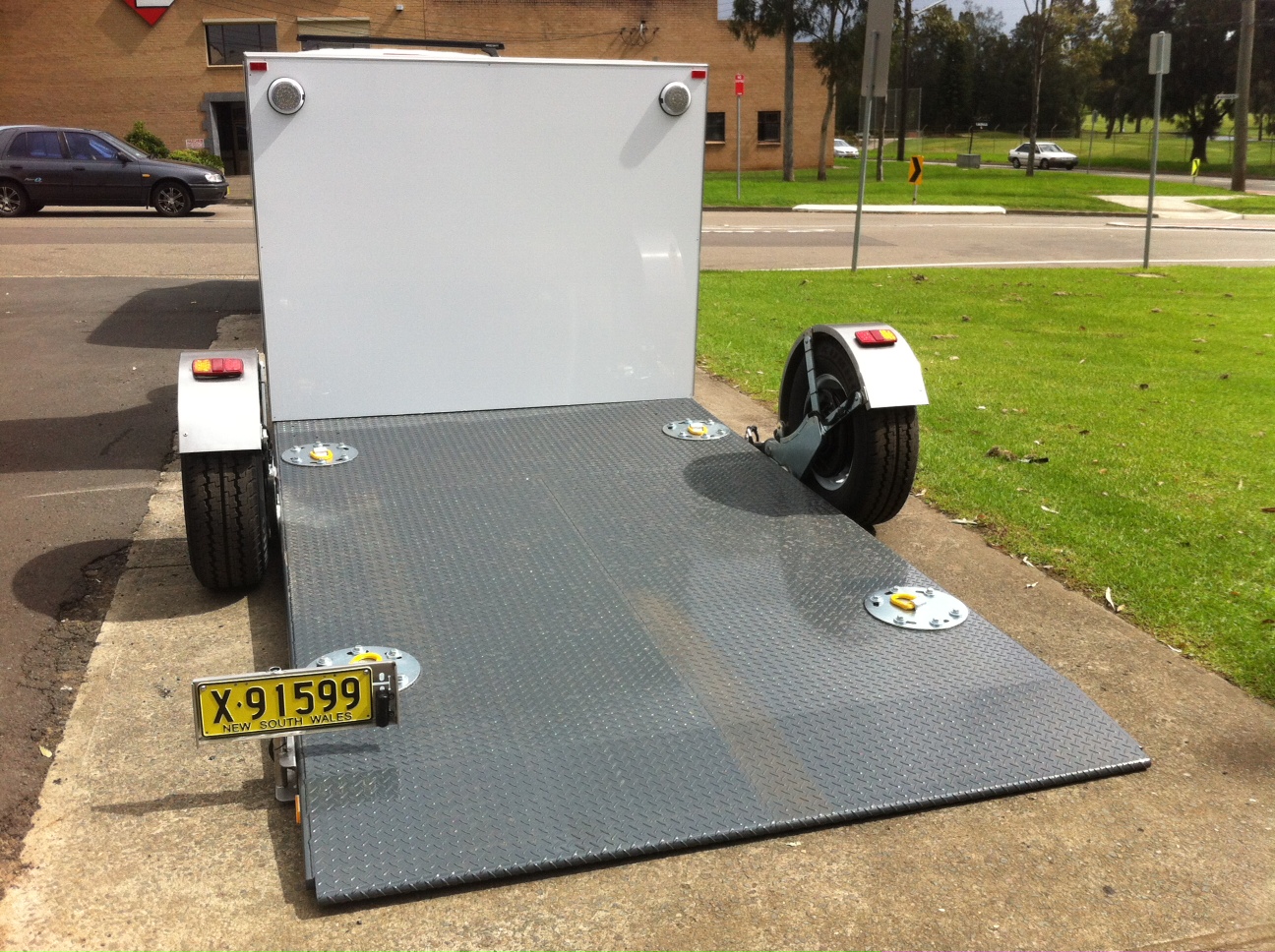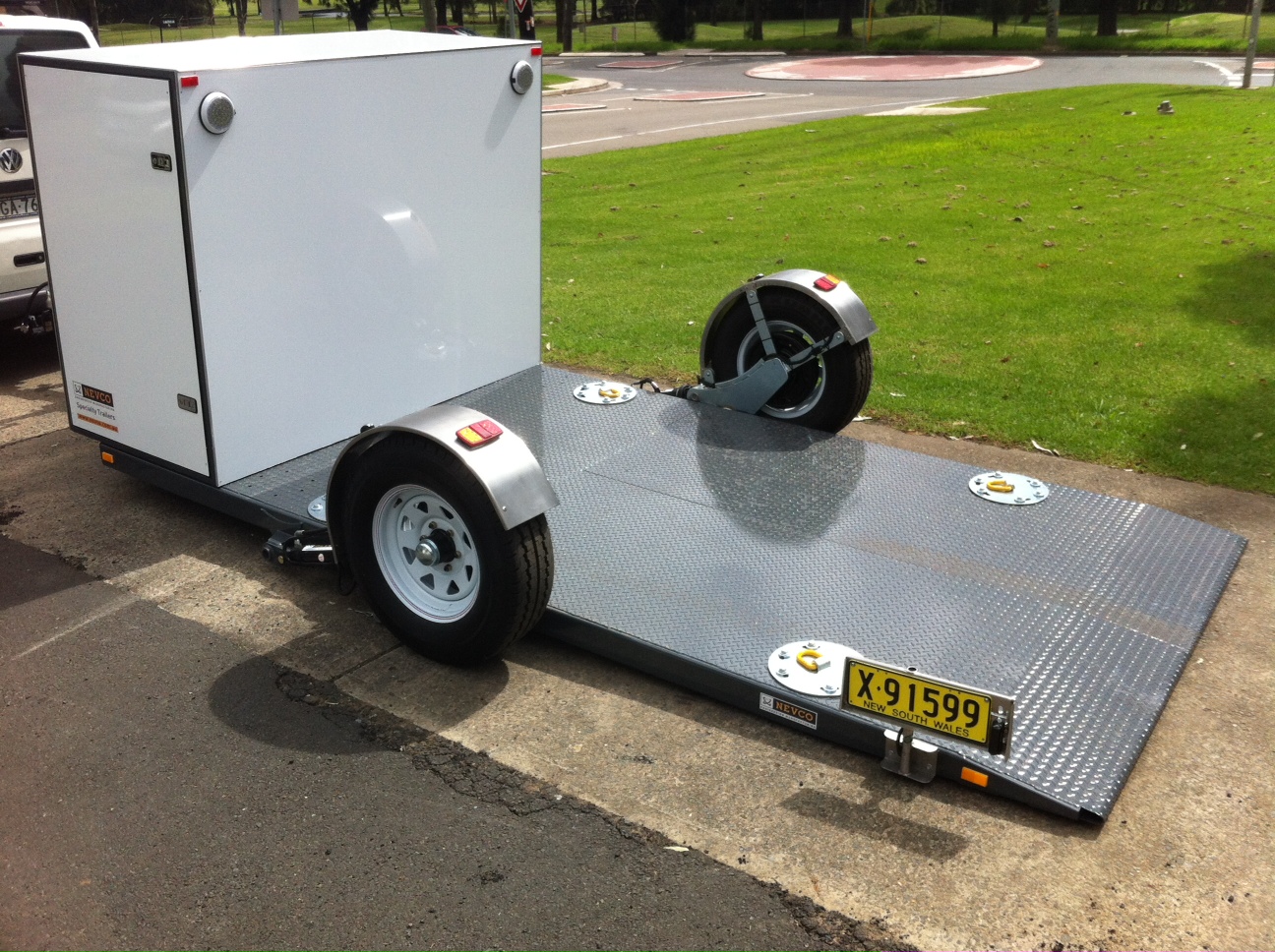Nevco Engineering designed and manufactured a ground loading Ezy Approach Trailer to carry a 2000kg TENNANT SWEEPER.