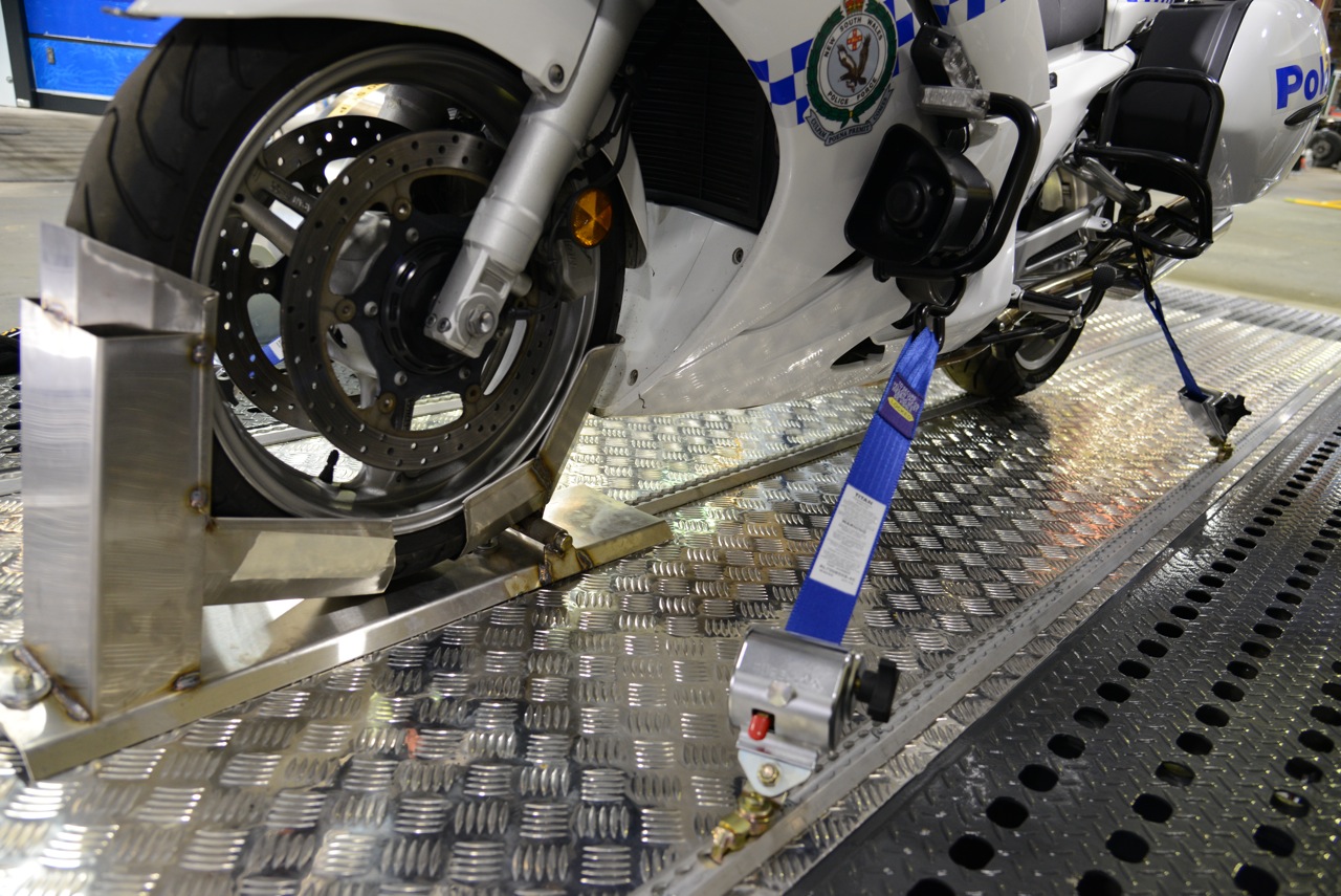 The images below illustrate the flexibility of the design. The mounted “L” track has been used together with a wheel restraint system which is designed to lock/click into the “L” track to transport motorcycles.